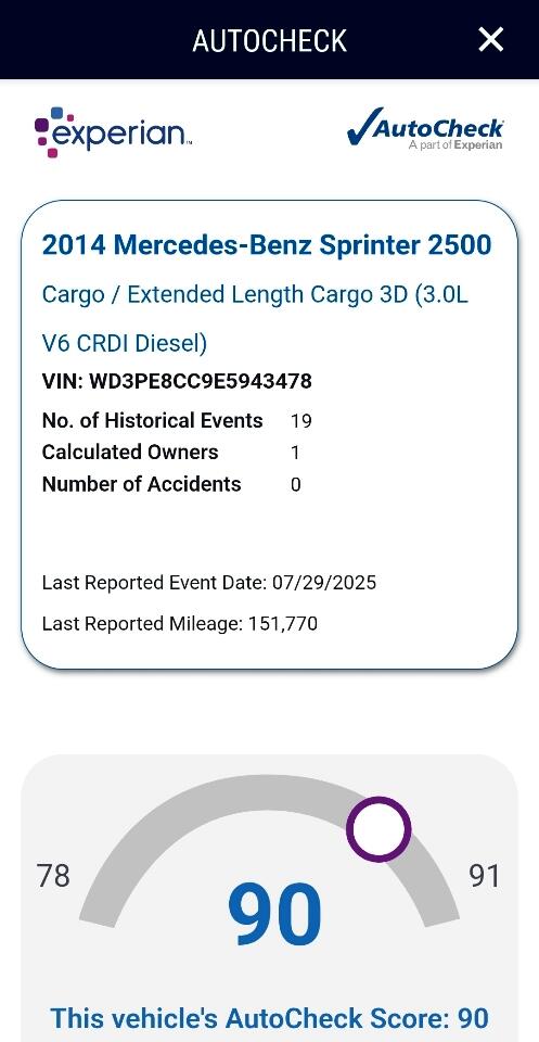 Selling a super clean 2014 Mercedes Benz Sprinter 1500 170" Wheel Base Three Quarter Ton Cargo Van /